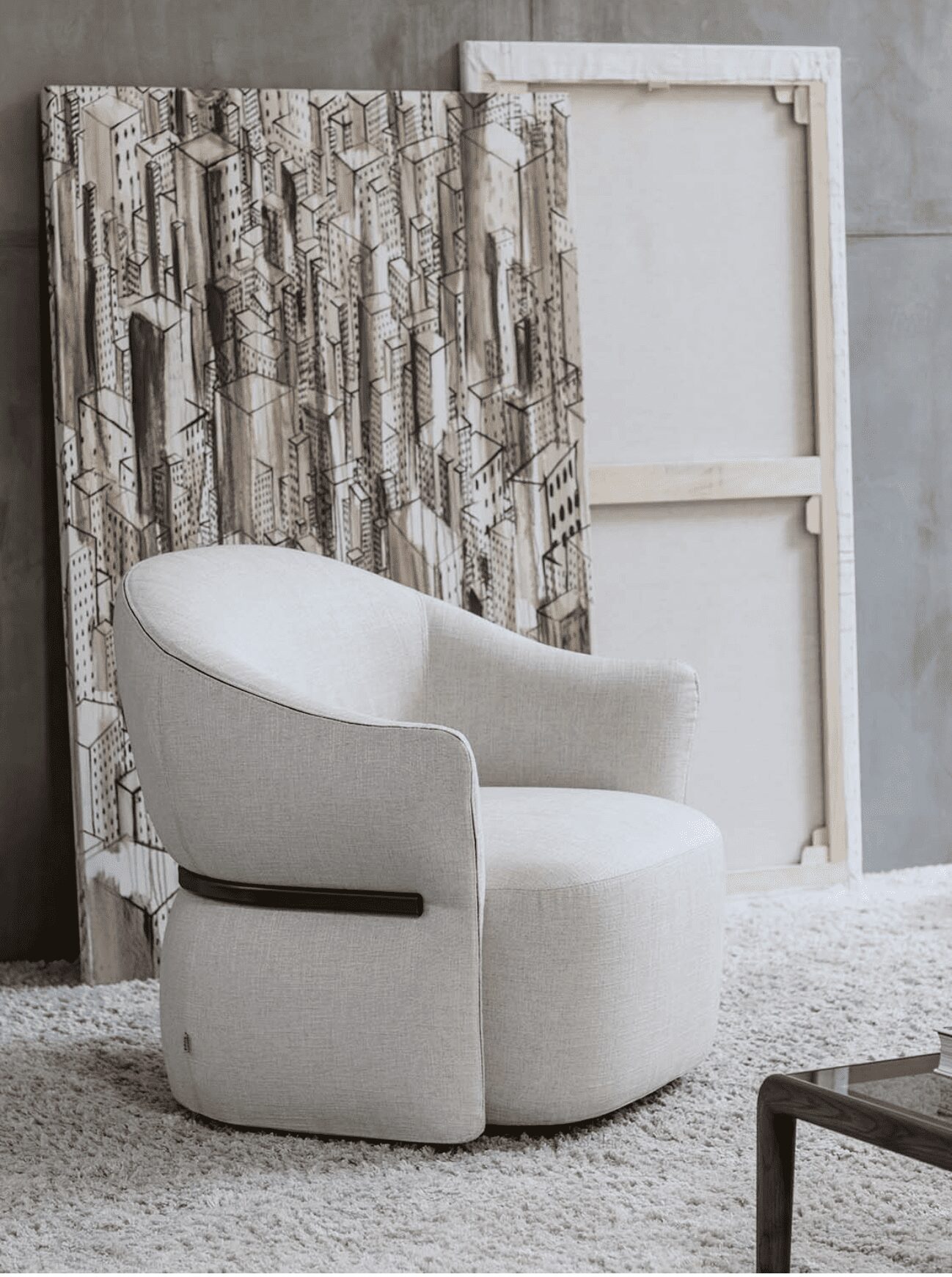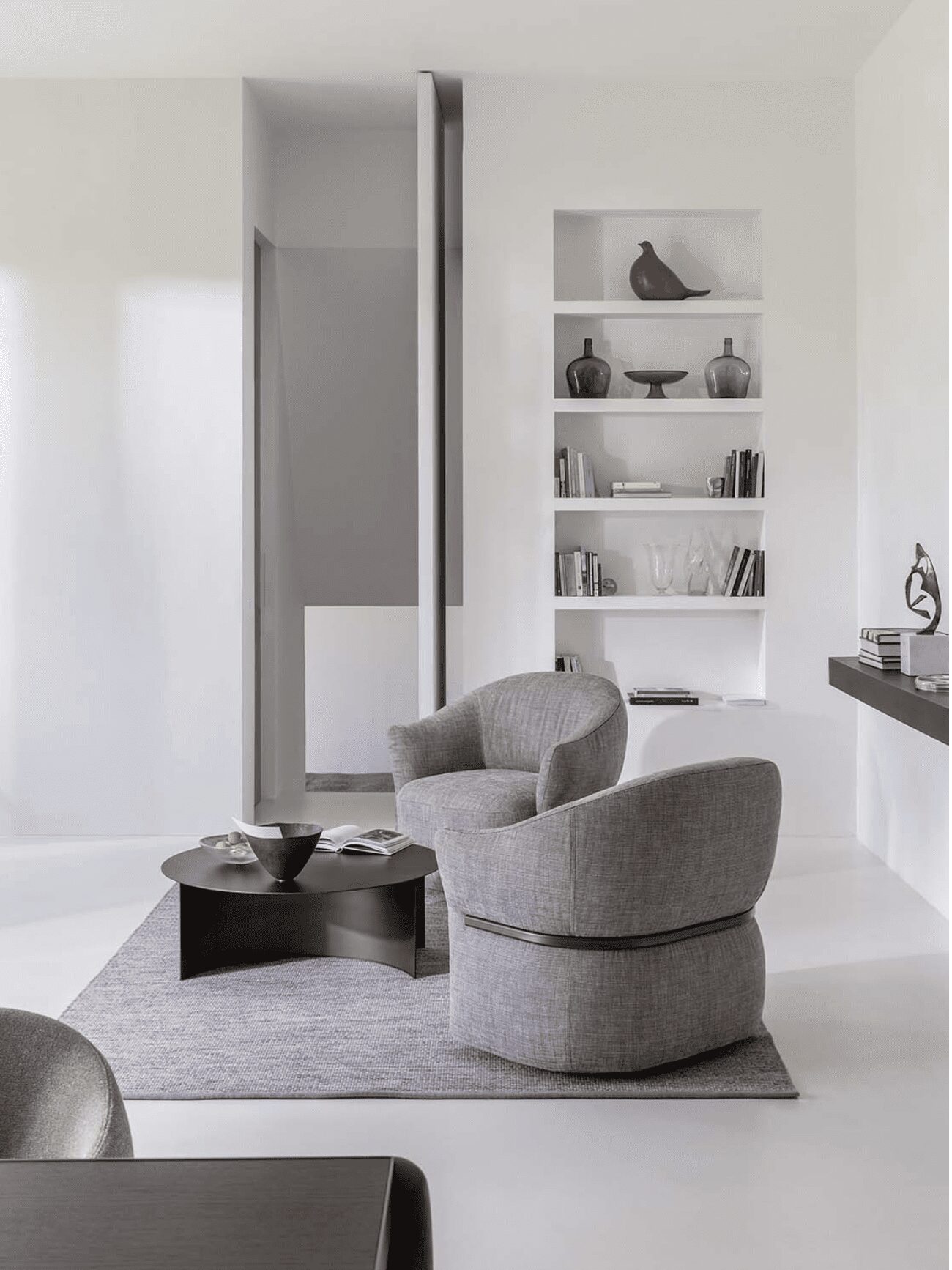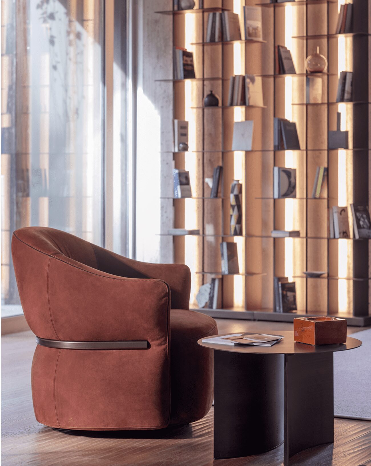 An armchair inspired by the shape of butterfly wings, from which the back design originates: a single, soft, undivided element offering comfort and support.