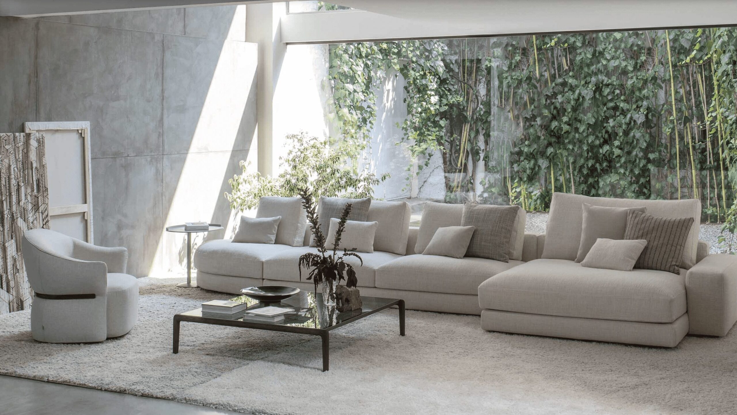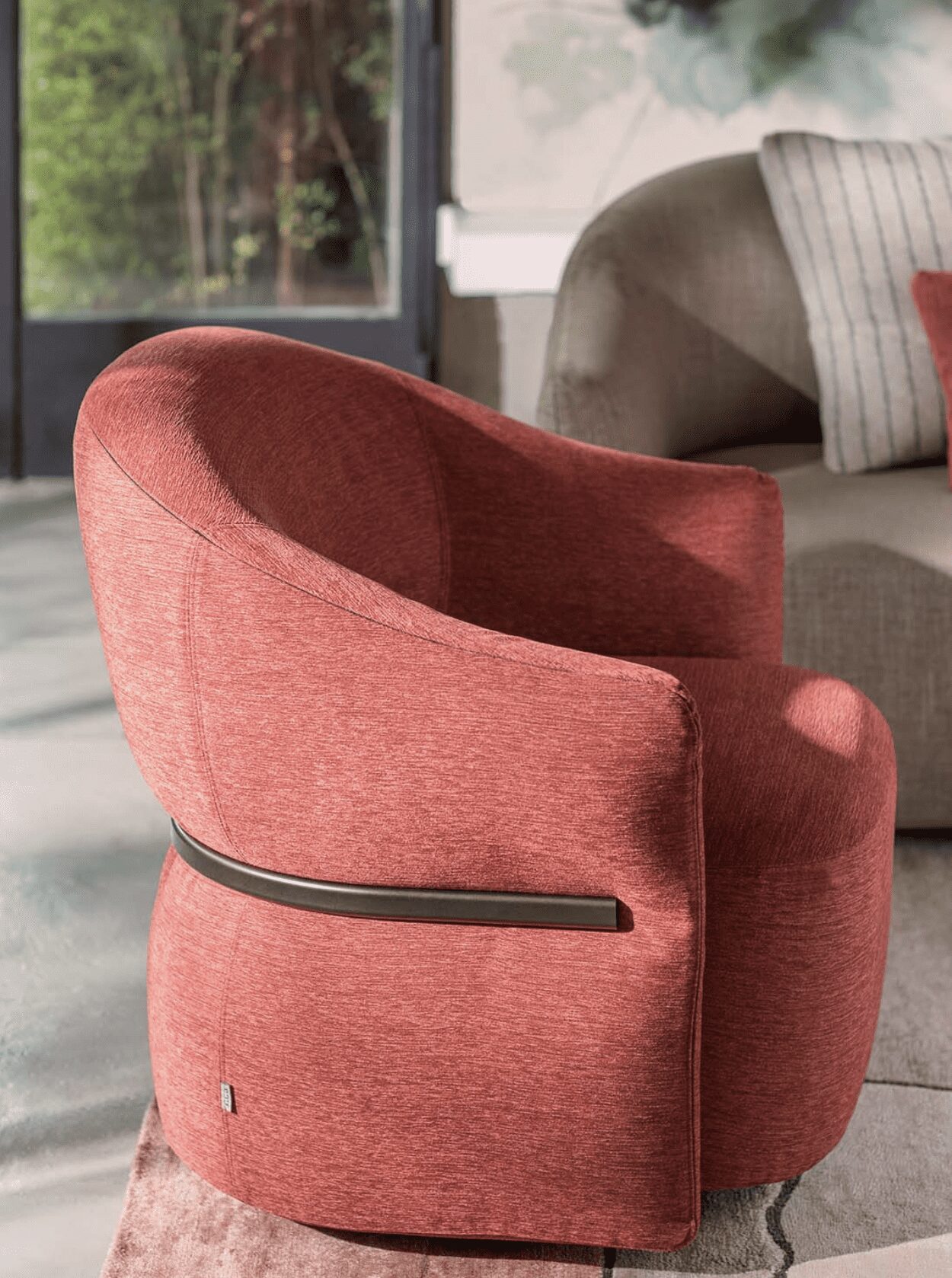A metal tubing delimits the outer part of the backrest and enhances the softness of the shapes. A detail of great elegance and definite decorative effect.