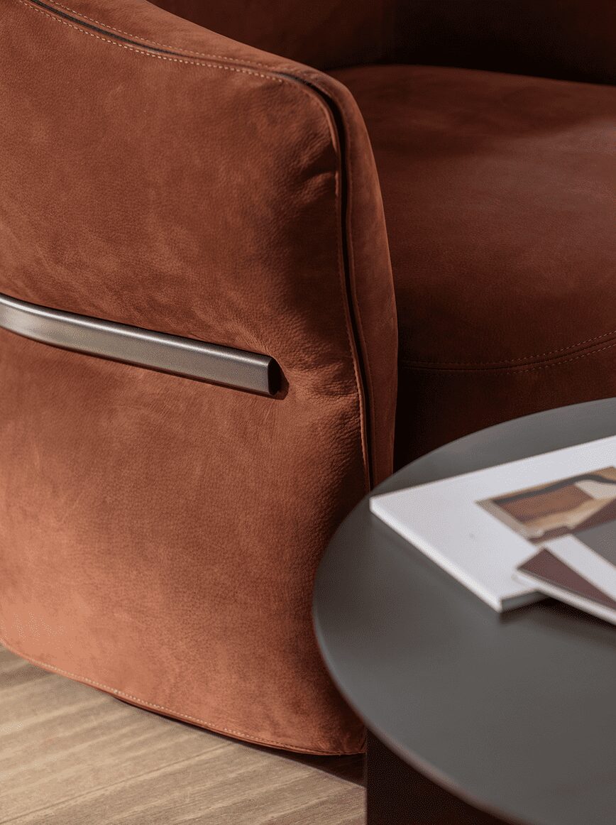 An armchair with a rounded, delicate and comfortable shape that seamlessly includes the seat, the arms and the back to accommodate your body and make you feel safe. Softness is emphasised by an anodic bronze finished tubular pipe enclosing and delimiting the outer part of the back and the arms; a marked detail of great elegance, harmony and decorative effect. Fully removable fabric or leather upholstery. The armchair is also available in a 360° swivel version. Madame Butterfly is also available as a two-seat sofa and three-seat sofa.
