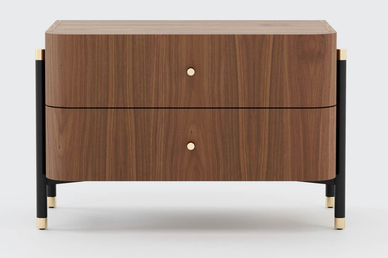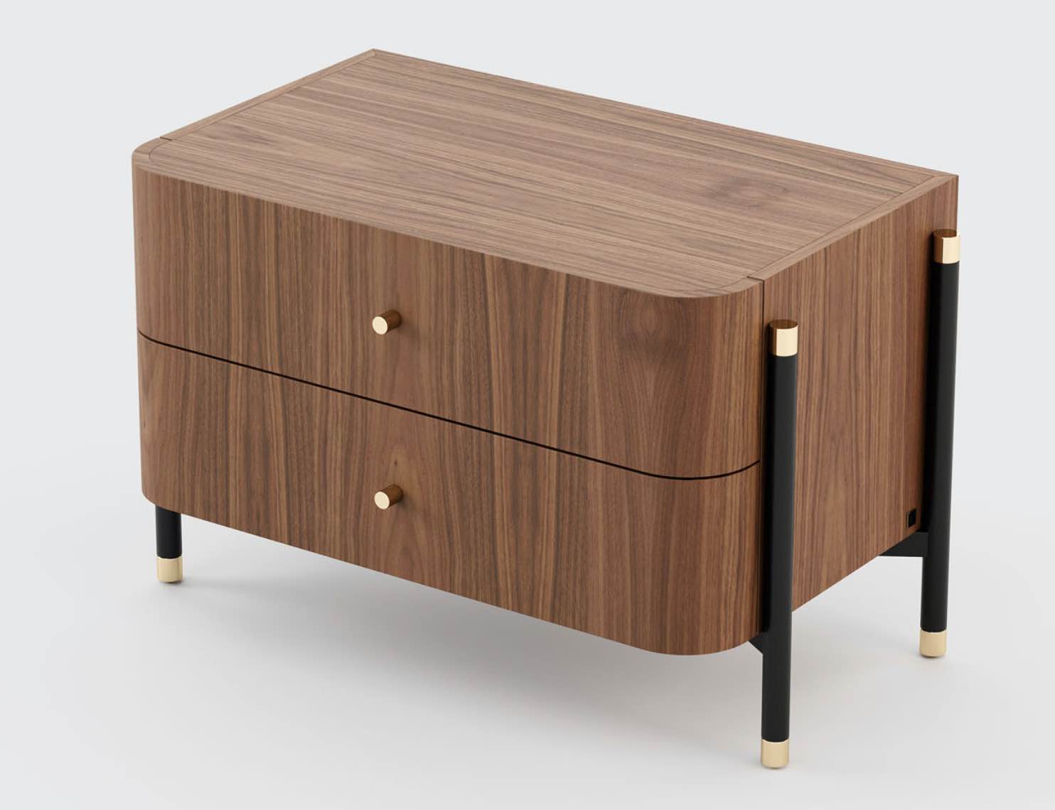 Materials & Finishes: Matte walnut, black iron and polished golden stainless steel